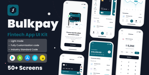 Welcome to Bulkpay, the ultimate Fintech App React Native CLI UI Kit that redefines the way you handle financial transactions. Developed with the latest in technology, Bulkpay provides a seamless and efficient solution for executing bulk payments, transfers, and various financial transactions. The app’s intuitive interface, powered by React Native CLI, ensures a responsive and user-friendly experience across multiple platforms.